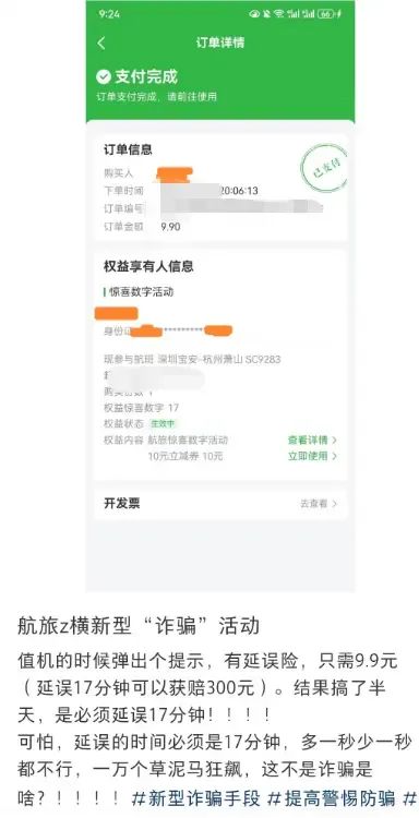 一位网友在社交平台上发文称,自己在值机时看到弹窗广告——“9.9元购延误险,延误21分钟可赔300元”,觉得性价比高就购买了两份。结果航班实际延误95分钟,正当她准备申请理赔时,才发现赔付条件竟是“精确延误16分钟”。最终她未能获得任何赔偿,只好发帖提醒他人“注意避坑”。