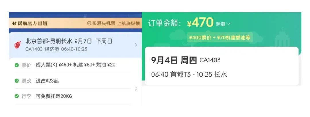 比如 9 月 7 日北京飞往昆明的同一航班机票,在某平台上只需 470 元,在航旅纵横上却要 520 元。