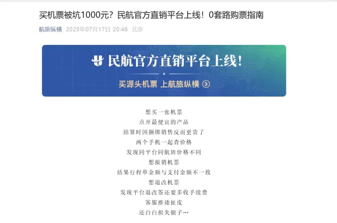 此前,7月17日,航旅纵横发布消息,宣布正式上线 “民航官方直销平台”,还打出了“0差价、0捆绑、0套路”的宣传语。