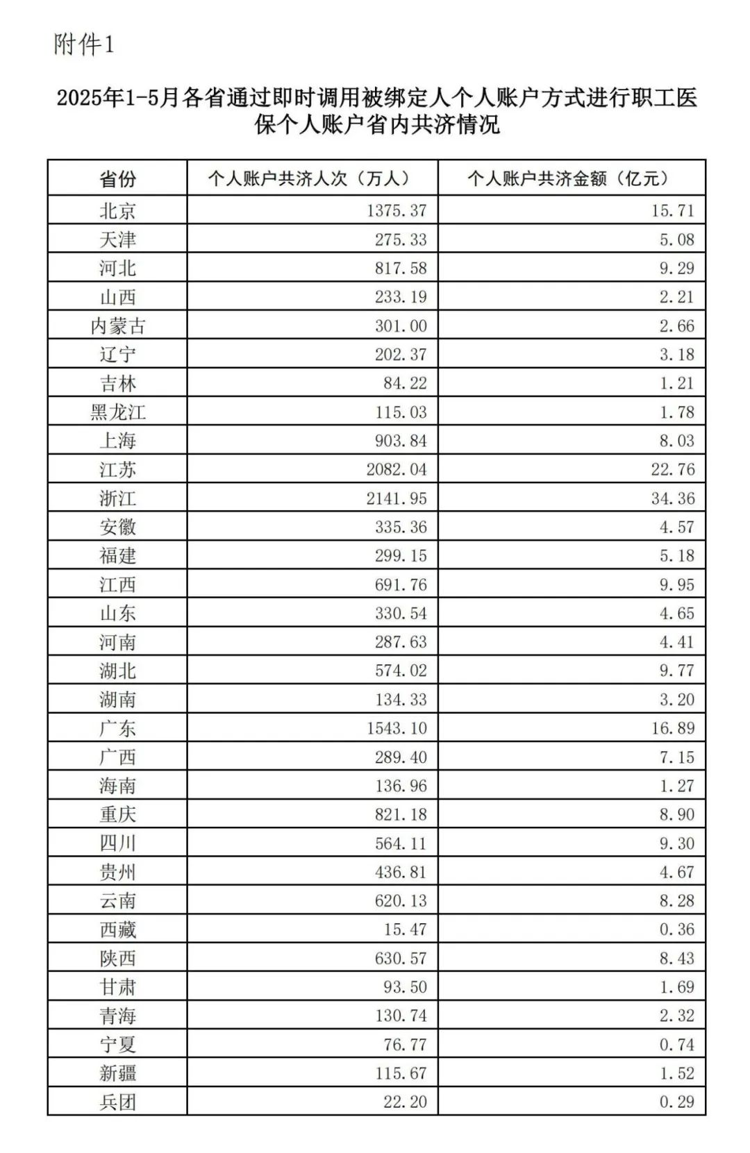 目前,职工医保个人账户共济可以通过即时调用被绑定人个人账户、医保钱包转账等方式实现。2025年1-5月职工医保个人账户共济人次1.67亿,金额220.26亿元。