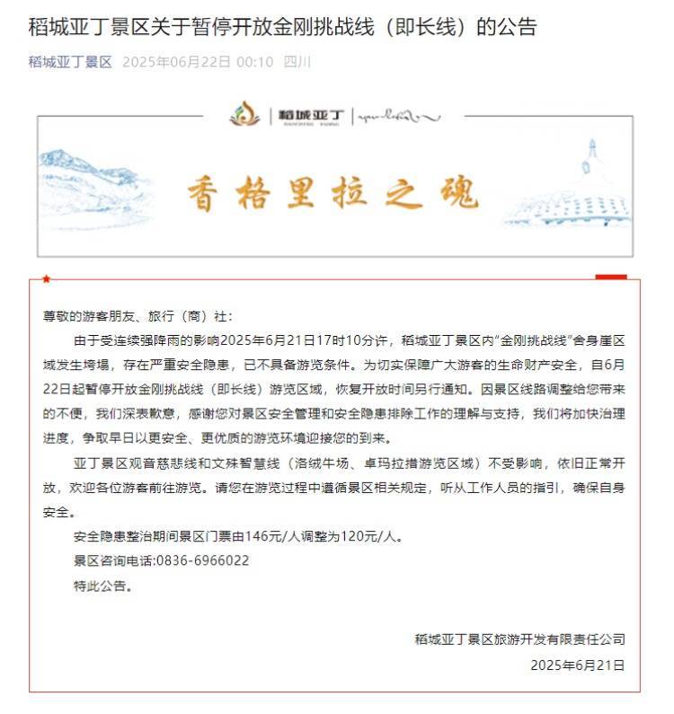 ▲微信公众号“稻城亚丁景区”发布公告。 网络图22日0时10分,微信公众号“稻城亚丁景区”发布公告称,暂停开放金刚挑战线(长线)。“由于受连续强降雨的影响,2025年6月21日17时10分许,稻城亚丁景区内‘金刚挑战线’舍身崖区域发生垮塌,存在严重安全隐患,已不具备游览条件。为切实保障广大游客的生命财产安全,自6月22日起暂停开放金刚挑战线(即长线)游览区域,恢复开放时间另行通知。因景区线路调整给您带来的不便,我们深表歉意,感谢您对景区安全管理和安全隐患排除工作的理解与支持,我们将加快治理进度,争取早日以更安全、更优质的游览环境迎接您的到来。亚丁景区观音慈悲线和文殊智慧线(洛绒牛场、卓玛拉措游览区域)不受影响,依旧正常开放,欢迎各位游客前往游览。请您在游览过程中遵循景区相关规定,听从工作人员的指引,确保自身安全。安全隐患整治期间景区门票由146元/人调整为120元/人。”