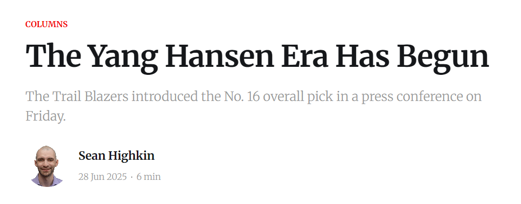 采访开拓者多年的队记Sean Highkin撰写了一篇关于杨瀚森的新文章,标题是“杨瀚森时代已经开启”。