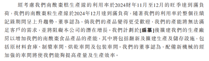 在此背景下,此次港股IPO,公司仍计划将部分募集资金投向产能扩建。齐云山食品表示,公司南酸枣糕生产线的利用率在2024财年11月至12月的旺季达到满负荷,公司的南酸枣粒生产线于2024年12月达到满负荷,现有产能无法满足客户需求,而配备新机械的经加强的车间将使公司能够提高产量及生产效率。
