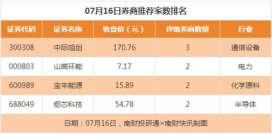 从券商推荐家数来看,7月16日有41家上市公司得到券商推荐,其中中际旭创获得3家推荐,山高环能、宝丰能源均获得2家推荐。