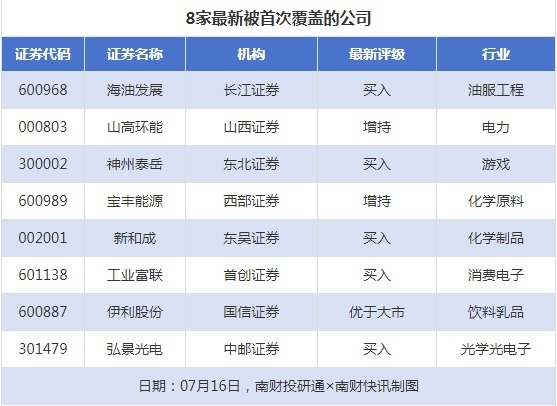 首次覆盖方面,7月16日券商共给出了8次首次覆盖,其中海油发展获得长江证券给予“买入”评级,山高环能获得山西证券给予“增持”评级,神州泰岳获得东北证券给予“买入”评级,宝丰能源获得西部证券给予“增持”评级,新和成获得东吴证券给予“买入”评级。