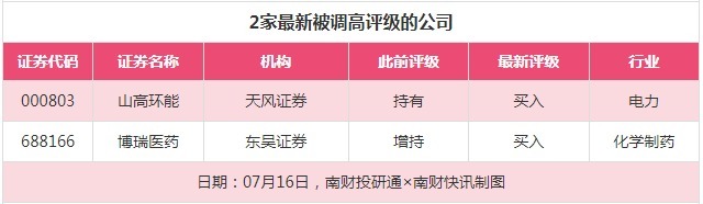 评级调高方面,7月16日,券商调高上市公司评级达到2家次,最新数据包括了天风证券对山高环能的评级从“持有”调高至“买入”粤有钱,东吴证券对博瑞医药的评级从“增持”调高至“买入”。